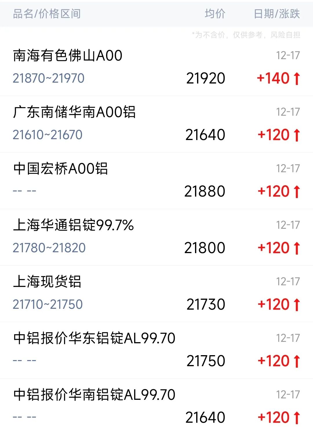 17日南海有色铝21870~21970均价21920涨140股票配资盘股票配资盘,不含20340~20440均价20390涨120
